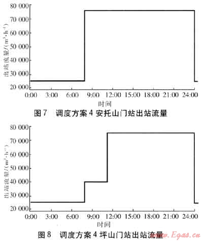 調(diào)度方案4:在安裝了流量遙調(diào)系統(tǒng)情況下,對(duì)安托山門站、坪山門站均進(jìn)行流量的遙調(diào)控制。在用氣高峰時(shí)段兩門站最大供氣流量分別為7.5×104m3/h,為使次高壓管網(wǎng)最大壓力不超過(guò)1.55MPa,低峰時(shí)段應(yīng)進(jìn)行供氣流量的限制。安托山、坪山門站的流量見圖7、8。