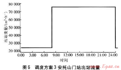 調(diào)度方案3:在安裝了流量遙調(diào)系統(tǒng)情況下,設(shè)定用氣高峰時(shí)段安托山門站最大供氣流量為7.5×104m3/h,不超過(guò)上游合同要求的最大小時(shí)提取速率。為使次高壓管網(wǎng)最大壓力不超過(guò)1.55MPa,在次高壓管網(wǎng)的設(shè)計(jì)壓力范圍內(nèi),低峰時(shí)段應(yīng)進(jìn)行供氣流量的限制。坪山門站出站壓力設(shè)定為1.5MPa,不進(jìn)行流量的遙調(diào)控制。安托山門站出站流量調(diào)整見圖6。
