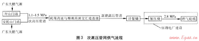 該方案綜合考慮西二氣到來(lái)后將使用的天然氣高壓管道與目前的天然氣次高壓管道,利用已建成的高壓管道與次高壓管道連接,通過(guò)次高壓管道供應(yīng)電廠。高壓管道的設(shè)計(jì)壓力為6.0MPa,運(yùn)行壓力為4.0MPa;次高壓管道的設(shè)計(jì)壓力為1.6MPa,門站出站運(yùn)行壓力為1.5MPa。在建的機(jī)荷高速、坂雪大道、環(huán)觀南路、平大路的高壓管道與煙廠調(diào)壓站后梅觀高速的次高壓管道連通后,即可通過(guò)該管道供應(yīng)電廠,全長(zhǎng)約13.6km,其中尚需建設(shè)部分為6.42km,從工期上來(lái)說(shuō),可以滿足需求。電廠內(nèi)需建設(shè)計(jì)量橇、加壓橇。工藝流程見圖3。