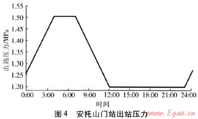 根據(jù)統(tǒng)計(jì)的歷史數(shù)據(jù),預(yù)測(cè)供氣期間最大用氣日24h各用氣點(diǎn)的用氣情況,比選的方案均按相同的用氣情況。調(diào)度方案1、2中,坪山門站的出站壓力設(shè)為定值1.5MPa,安托山門站的出站壓力按圖4調(diào)整。