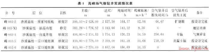 高峰場區(qū)塊氣體鉆井共應用5口井——峰003-2、峰003-X3、峰003-4、峰003-5、峰003-6井(表1),氣體鉆井取得的進尺較高,總進尺9461.29m,3口井按設計井段完成,最高機械鉆速14.68m/h,平均機械鉆速12.39m/h。氣體鉆井5口井中有2口井無時間損失,其余3口井總損失時間1061.89h,其損失時間很大部分是由于氣體鉆井后的后續(xù)技術(shù)措施不妥造成的。