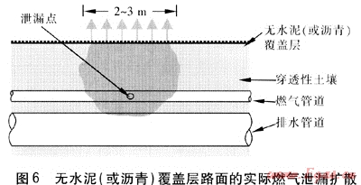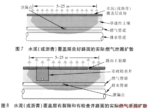 圖7為水泥(或瀝青)覆蓋層良好路面的實際燃氣泄漏擴散[6、7]。圖8為水泥(或瀝青)覆蓋層有裂隙和有檢查井路面的實際燃氣泄漏擴散[8]。
