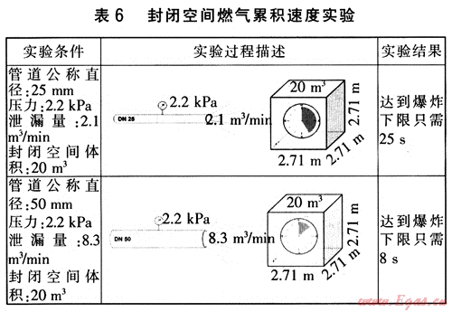 從表6不難看出,燃氣泄漏后在封閉空間的累積速度非??欤@就意味著在封閉空間燃氣泄漏非常危險。