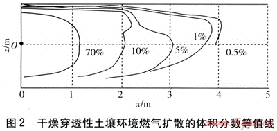 圖1為干燥天氣下穿透性土壤環(huán)境燃氣擴散的體積分?jǐn)?shù)等值線。圖中原點0為泄漏點(以下各圖同)。