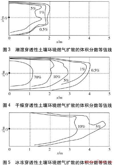 圖4為干燥穿透性土壤環(huán)境燃氣擴散的體積分?jǐn)?shù)等值線,圖5為冰凍穿透性土壤環(huán)境燃氣擴散的體積分?jǐn)?shù)等值線。