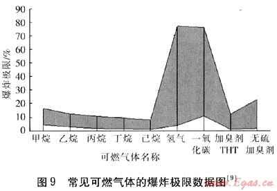 由于可燃氣體種類很多而性質(zhì)差異很大,為統(tǒng)一地描述其爆炸特性,通常采用爆炸極限這一參數(shù)。特別需要指出的是,某種可燃氣體的爆炸極限的值是通過實驗得到的客觀恒定值。圖9是常見可燃氣體的爆炸極限數(shù)據(jù)圖[9],表5是常見可燃氣體的爆炸極限數(shù)據(jù)表[9]。