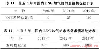 對(duì)LNG燃料汽車發(fā)展進(jìn)度影響最大的是配套LNG加氣站的建設(shè)。目前,我國(guó)3大能源企業(yè)(中石油、中石化、中海油)及新疆廣匯、新奧燃?xì)狻⒅袊?guó)港華燃?xì)?、華潤(rùn)燃?xì)獾纫慌鞠嗬^進(jìn)入了LNG替代汽柴油用于新能源汽車的研究領(lǐng)域,并相應(yīng)作出了3~5年建設(shè)LNG汽車加氣站、生產(chǎn)LNG公交汽車和重型卡車的規(guī)劃。表11、12分別是最近3年內(nèi)國(guó)內(nèi)LNG加氣站的發(fā)展情況及未來3年的市場(chǎng)需求情況統(tǒng)計(jì)[5]。