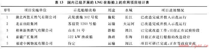 2009年4月,全球首套LNG船用燃料儲(chǔ)存供氣系統(tǒng)由張家港富瑞特種裝備股份有限公司下屬的控股子公司張家港韓中深冷科技有限公司研發(fā)試制成功并順利交付客戶挪威漢姆沃斯公司。同時(shí),在國(guó)內(nèi)LNG船舶油改氣項(xiàng)目也有了長(zhǎng)足的發(fā)展。截至目前,已經(jīng)先后有湖北西籃、北京油陸、桂林新奧燃?xì)?、新疆廣匯、福建中閩等多家能源企業(yè)為了搶占LNG在船舶領(lǐng)域的應(yīng)用市場(chǎng)而開展了船舶燃料油改氣示范項(xiàng)目的運(yùn)作(表13)。