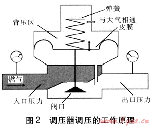回顧調(diào)壓器的工作原理,不難發(fā)現(xiàn),影響調(diào)壓的因素有彈簧、皮膜、皮膜上下方壓力差。調(diào)壓器調(diào)壓的工作原理見(jiàn)圖2。