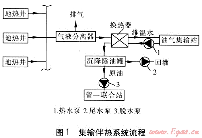該工程分為一期和二期,一期主要內(nèi)容是地?zé)崴糜谟蜌饧敯闊嵯到y(tǒng)的維溫,二期是在一期的基礎(chǔ)上,增加地?zé)岚l(fā)電系統(tǒng)和擴(kuò)增集輸站點(diǎn),本文只涉及一期工程內(nèi)容。一期主要工程內(nèi)容為:對8口改造后的地?zé)崽嵋壕涮准敯闊嵯到y(tǒng);新建地?zé)崴畵Q熱站及配套維溫水集輸管線;對2個油氣集輸站點(diǎn)(留一聯(lián)合站、路3站)的集輸伴熱系統(tǒng)進(jìn)行改建,把經(jīng)換熱站升溫后的維溫水連接到油氣集輸站內(nèi)。