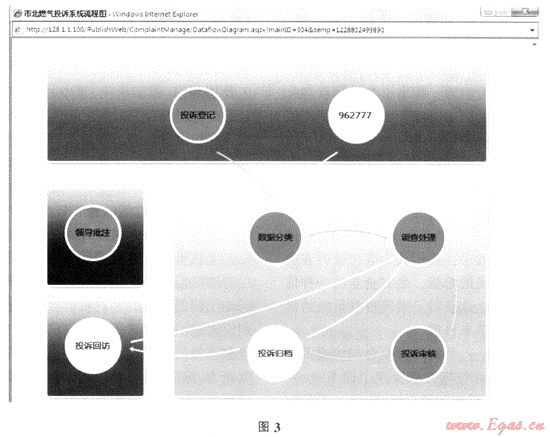 由于每條投訴信息均規(guī)定了統(tǒng)一的處理流程,因此,我們可以通過系統(tǒng)查詢某條信息正處于投訴處理的哪個(gè)階段,并以不同顏色予以區(qū)分,其中,綠色表示已經(jīng)通過的階段,白色表示尚未完成的階段,并且,某條投訴若上級(jí)或領(lǐng)導(dǎo)作過批注,則以紅色表示,具體如圖3所示:
