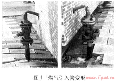 由于土壤荷載分布不均勻而產(chǎn)生建筑物的不均勻沉降,從而導(dǎo)致燃?xì)庖牍馨l(fā)生位移或變形,危及燃?xì)夤艿赖陌踩瑧?yīng)引起高度重視,采取有效措施加以防范[3~6]。大慶市東、西兩城區(qū)城市燃?xì)馔ピ汗艿啦糠治挥诟咚粎^(qū)域,冬季土壤的凍脹加劇了建筑物下部土壤荷載分布的不均勻程度,造成持力層地基土的附加應(yīng)力不均勻,從而造成土體總壓縮變形的不均勻,突出表現(xiàn)為建筑物基礎(chǔ)附近的不均勻沉降,由此造成燃?xì)庖牍馨l(fā)生位移或變形,見圖1。