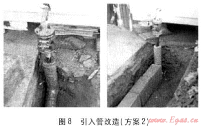 ② 將原有變形管道切割,焊接金屬波紋軟管,見圖7左。