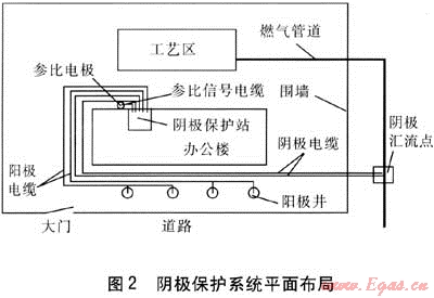 2008年為了保證福建LNG福州天然氣項目按期投產(chǎn),福州華潤燃氣有限公司在福州城門建設管輸天然氣門站,同時為保護市政中壓燃氣管道,在城門門站新建外加電流深井陽極陰極保護系統(tǒng)。該陰極保護系統(tǒng)平面布局見圖2。