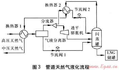 高壓天然氣經(jīng)換熱器1預(yù)冷部分液化后,進(jìn)入氣液分離器,分離出的液相經(jīng)節(jié)流閥膨脹至中壓,溫度降低,形成氣液混合物。分離出的氣相經(jīng)分流器分為兩股,一股進(jìn)入膨脹機(jī)膨脹至中壓,溫度劇降,形成氣液混合物;另一股經(jīng)換熱器2預(yù)冷部分液化后,再經(jīng)節(jié)流閥膨脹至中壓后,也形成氣液混合物。三股氣液混合物一起送到閃蒸罐中,分離出氣相天然氣(中壓)和LNG,前者作為原料氣預(yù)冷冷源,換熱后進(jìn)入中壓管網(wǎng),后者進(jìn)入LNG儲(chǔ)罐儲(chǔ)存。在城市門(mén)站安裝帶膨脹機(jī)的天然氣液化裝置,用氣低谷時(shí)通過(guò)膨脹機(jī)產(chǎn)生冷量用于天然氣液化。生成的LNG輸入儲(chǔ)罐,用氣高峰時(shí)將其氣化起到調(diào)峰作用。
