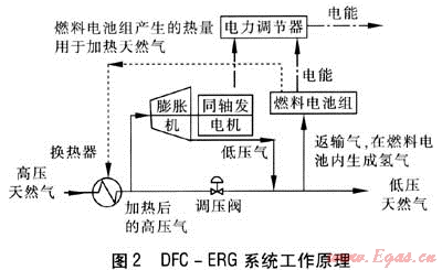 近年來(lái),美國(guó)、英國(guó)一些公司將膨脹機(jī)技術(shù)與其他技術(shù)聯(lián)合,以回收調(diào)壓過(guò)程中的壓力能,研究工作取得了一定進(jìn)展。2008年10月,北美Enbridge公司將膨脹機(jī)與燃料電池組合在一起形成DFC-ERG系統(tǒng)[6],并在加拿大多倫多門(mén)站進(jìn)行了現(xiàn)場(chǎng)試驗(yàn),該聯(lián)合裝置的發(fā)電功率為2200kW。DFC-ERG系統(tǒng)工作原理見(jiàn)圖2。