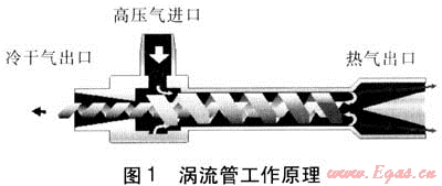 渦流管具有能量分離特性,高壓氣經(jīng)渦流管減壓處理后,將會(huì)在管中心產(chǎn)生一股冷流,在外側(cè)產(chǎn)生一股熱流。由于渦流管內(nèi)強(qiáng)烈的離心作用,中心的冷流氣體為干燥氣體,外側(cè)高溫氣體則集中了渦流管效應(yīng)(含節(jié)流效應(yīng))產(chǎn)生的所有液體。渦流管工作原理見(jiàn)圖1[4]。