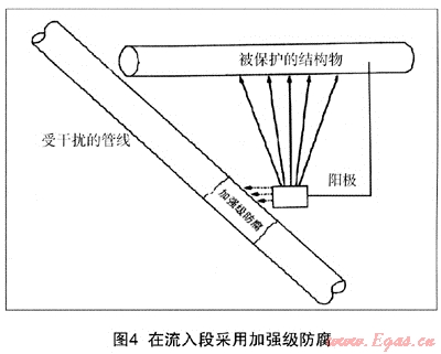 對于雜散電流腐蝕的防護,人們有個誤區(qū),往往會在流出段采用加強級防腐,因為這里的管道正在被腐蝕。這樣做的結(jié)果只是腐蝕區(qū)域的前后轉(zhuǎn)移,而無法避免腐蝕的發(fā)生,因為流入的電流總是要流出的。對于舊管道維修,由于通常只修補大的破損點,使得腐蝕電流更集中在未修補的小破損點處,形成“大陰極小陽極”的嚴(yán)重腐蝕局面,反而加快了穿孔的速度。正確的做法是,要在流入段(靠近其他被保護構(gòu)筑物的輔助地床處)采用加強級防腐,盡力避免雜散電流的流入(圖4)。