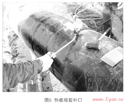 熱收縮套結(jié)構(gòu)與膠粘帶類似,但聚乙烯背材為輻射交聯(lián)后拉伸定型的,膠粘劑是熱熔膠,而非壓敏膠。在現(xiàn)場將之松松地套在焊口上,用火焰烘烤外側(cè)時,背材會緊密地收縮包覆在鋼管上,內(nèi)層膠粘劑會熔化填充所有空隙,與管體防腐層一同構(gòu)成連續(xù)的防腐結(jié)構(gòu)(圖5)。