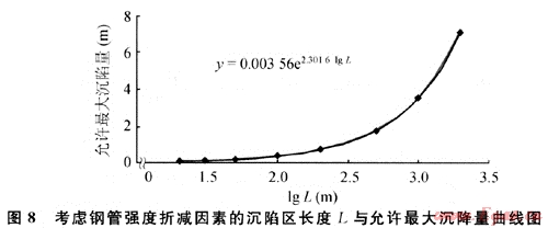 2) 根據(jù)《輸氣管道工程設(shè)計(jì)規(guī)范》[3]的有關(guān)規(guī)定,在輸氣管道系統(tǒng)中,支管道沒(méi)有軸向約束(如固定支墩或其他錨固件)時(shí),使管道附件產(chǎn)生的彎曲應(yīng)符合公式:σe≤0.72σs(σe為組合應(yīng)力;σs為管道的最低屈服強(qiáng)度),按假設(shè)受力模型的簡(jiǎn)化分析和采用的算例,X70鋼管屈服強(qiáng)度為485MPa,則0.72σs=349.2MPa,可得管道通過(guò)不同長(zhǎng)度沉陷區(qū)的允許最大沉陷量和其回歸方程(圖8)。