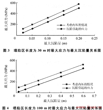 3) 在分別求取了不同的沉陷區(qū)長(zhǎng)度和不同的最大沉陷量計(jì)算最大應(yīng)力值的基礎(chǔ)上,利用最小二乘法求得了相應(yīng)的回歸方程。
