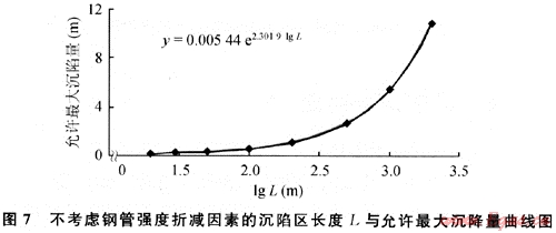 1) 按假設(shè)受力模型的簡(jiǎn)化分析和所采用的計(jì)算方法,X70鋼管屈服強(qiáng)度為485MPa,并以此作為管道遭遇危險(xiǎn)的判定標(biāo)準(zhǔn),在不考慮鋼管強(qiáng)度的折減因素前提下,可得管道通過(guò)不同長(zhǎng)度沉陷區(qū)的允許最大沉降量,并用最小二乘法建立了管道允許最大沉陷量與沉陷區(qū)長(zhǎng)度的回歸方程,結(jié)果如圖7所示。