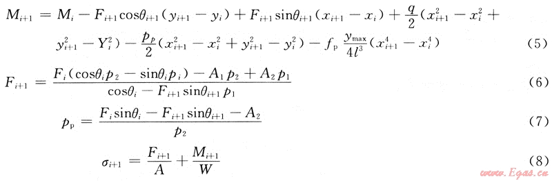 式中:A1=q(yi+1-yi);A2=q(xi+1-xi);p1=yi+1-yi+(xi+1-xi)tanφp;p2=-(xi+1-xi)+ (Yi+1-yi)tanφp;Fi為第i點(diǎn)管端軸力;Mi為第i點(diǎn)管端彎矩;σi為第i點(diǎn)管端應(yīng)力;θi為第i點(diǎn)管端各點(diǎn)轉(zhuǎn)角;W為管道彎曲截面系數(shù)。