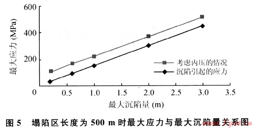 2) 按開(kāi)采沉陷引起的管道中最大應(yīng)力值、內(nèi)壓與開(kāi)采沉陷引起的管道中最大應(yīng)力值組合分別計(jì)算,結(jié)果見(jiàn)圖3~5。