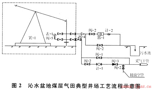 采用套管采氣、油管采水的井場(chǎng)工藝。井口由抽油機(jī)將地層水采出,通過(guò)消氣器將水中攜帶的氣體分離,經(jīng)水表計(jì)量后排至井場(chǎng)污水池中。煤層氣從煤層中解吸后由套管采出,通過(guò)井場(chǎng)智能旋進(jìn)流量計(jì)計(jì)量后,經(jīng)采氣管線輸送至集氣站。井場(chǎng)設(shè)置放空火炬及排采放空接口,在排采及事故時(shí)將煤層氣放空焚燒。井場(chǎng)工藝流程圖見(jiàn)圖2所示。