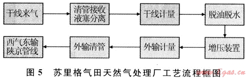 原料氣進(jìn)廠前設(shè)緊急截?cái)嚅y,可在中央處理廠或集氣干線緊急情況下的自動(dòng)切斷。氣體先進(jìn)入集氣裝置經(jīng)過(guò)濾分離器分離出攜帶的液體及粉塵等雜質(zhì),經(jīng)計(jì)量后輸往增壓裝置,再進(jìn)入脫水裝置,脫水后的凈化氣計(jì)量后去輸氣管道首站進(jìn)入就近的西氣東輸主管道。沁水盆地中央處理廠工藝流程框圖見(jiàn)圖6。