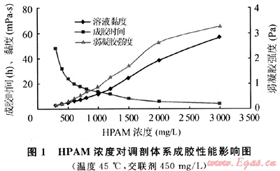 將主劑聚丙烯酰胺(YG100)按實驗要求的濃度預先配制溶解好,交聯(lián)劑(YG102-1及G102-3)按一定濃度預先配制好。實驗時取一定量預先溶解好的HPAM溶液于燒杯中,再按照配方要求分別將交聯(lián)劑加入,同時攪拌均勻即形成調(diào)剖劑溶液。將調(diào)剖劑溶液倒入試管并密封,放入一恒溫水浴中,記下放入時間,定期觀察溶液的流動情況(用燒杯倒出觀察),溶液不流動時或明顯形成具有一定舌長的凝膠時的時間與放入時時間差即為成膠時間。采用德國HAAKE公司生產(chǎn)的RS-150流變儀測定交聯(lián)體系的表觀黏度、黏彈性強度(主要是彈性模量)。