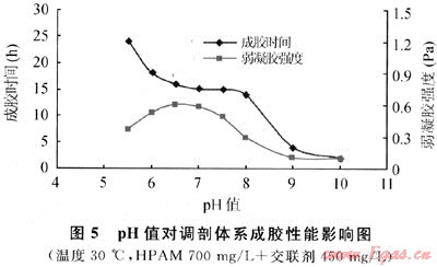 在HPAM/Cr3+交聯(lián)體系中,pH值對體系溶液是否成膠有著決定性的影響,對HPAM—YG102-3交聯(lián)體系成膠性能影響實驗結(jié)果見表1、圖5。
