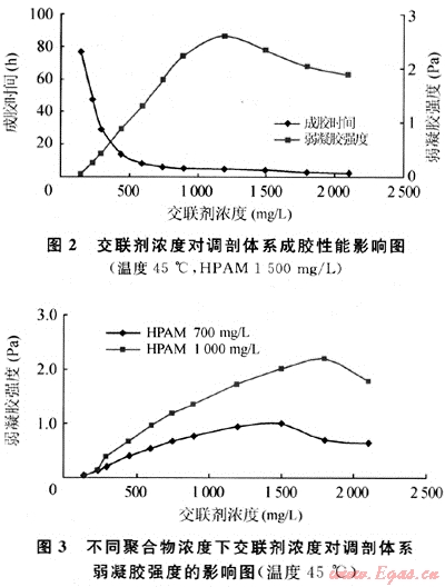 由圖1可見,聚合物濃度增加,體系成膠時間縮短。同時形成的弱凝膠強度隨著HPAM濃度的增加而增強。但當HPAM濃度大于2000mg/L時,雖然凝膠強度增加到1Pa以上(按凝膠強弱分級為較強凝膠),但成膠時間縮短到10h以下,這在大劑量深部處理時易導致前期調(diào)剖劑段塞反應太快而使后面的調(diào)剖劑注入困難。此外,HPAM濃度越高,調(diào)剖體系溶液越黏稠,配制及注入都相對要困難些。在弱凝膠強度及性能滿足作業(yè)要求條件下,低濃度可獲得較低的成本。但濃度不能低于400mg/L,因為HPAM濃度在400mg/L以下時弱凝膠強度很弱,穩(wěn)定1~2周后有少量的游離水,但弱凝膠HPAM濃度在500mg/L以上時,形成的弱凝膠性能則穩(wěn)定。