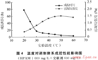 溫度是交聯(lián)化學反應最敏感因素之一,尤其是對成膠時間的影響。在HPAM YG103弱凝膠交聯(lián)反應中,過高的溫度會使弱凝膠破膠水化,筆者考察了30~50℃條件下調(diào)剖劑體系成膠性能的影響。實驗中固定交聯(lián)體系配方,將體系溶液分別置于不同溫度的水浴中,定期觀測交聯(lián)體系的成膠時間及形成弱凝膠的強度。實驗結(jié)果見圖4。