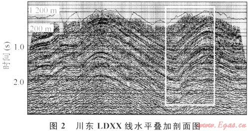 圖2為四川盆地東部某地區(qū)LDXX線水平疊加剖面,剖面上方為地表高程曲線??梢钥闯觯涸摐y線地表起伏劇烈,海拔高程在280~1180m之間,部分地段地形切割厲害,橫向100m范圍內(nèi)高程差達800m。從水平疊加剖面能看到,資料信噪比較高,但地覆構(gòu)造比較復(fù)雜,各種地震波發(fā)育。根據(jù)以往的地震地質(zhì)經(jīng)驗及鉆井分析,該地區(qū)速度橫向變化不大,完全滿足疊前時間偏移條件,使用疊前時間偏移技術(shù),能較好地使繞射歸位,提高資料橫向分辨率,較準(zhǔn)確地落實地腹構(gòu)造形態(tài)。