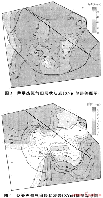 在儲層橫向對比的基礎上,編制了層狀灰?guī)r(XVp)、塊狀灰?guī)r(XVm)有效儲層等厚圖(圖3、4),層狀灰?guī)r有效儲層厚度0~20m,不完全受構造控制,在Sam-17、Sam-15、Sam-6井區(qū)還受巖性控制;總體上高值區(qū)位于構造高部位,同時在構造高部位又分為東、西兩個高值區(qū)(厚度大于15m),而中部有一個較明顯的低值區(qū)。塊狀灰?guī)r有效儲層厚度0~90m,完全受構造控制。高值區(qū)位于構造高部位,最厚區(qū)在Sam-123~Sam-51~Sam-53井一線(厚度大于70m)。