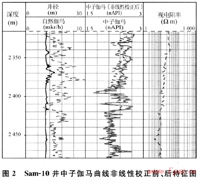 非線性校正后,中子伽馬曲線幅度變化的靈敏性有很大提高,可以滿足孔隙度計算的要求(圖2)。