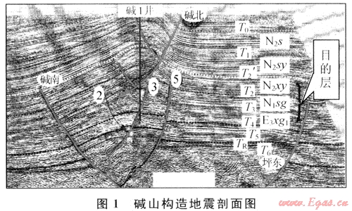 堿山構(gòu)造新近系自晚燕山運(yùn)動(dòng)以來,先后經(jīng)歷了多次喜山運(yùn)動(dòng)[7]。強(qiáng)烈的擠壓構(gòu)造運(yùn)動(dòng),一方面在本區(qū)形成了背斜構(gòu)造,為天然氣的聚集提供了可能的場所,但另一方面構(gòu)造運(yùn)動(dòng)形成的斷裂,會(huì)破壞構(gòu)造的完整性,將構(gòu)造分割成不同的斷塊,不利于天然氣的聚集,其中堿北斷裂斷至地表,對成藏極為不利。堿山構(gòu)造淺層與深層以T3為界分成兩部分,深層構(gòu)造受早期高角度逆沖斷層控制,在剖面上表現(xiàn)為兩斷夾一隆基底卷入型構(gòu)造樣式;淺層構(gòu)造受淺層滑脫斷層即堿北斷層控制,形成蓋層滑脫型構(gòu)造樣式(圖1)。