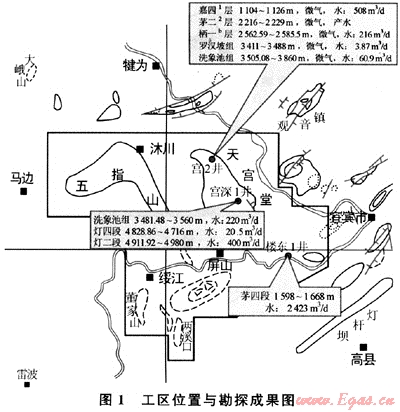 五指山構造區(qū)位于四川盆地西南邊緣,區(qū)域構造屬于四川盆地川中隆起平緩構造區(qū)及川東南坳陷帶,西鄰峨眉-涼山斷塊帶,北部緊鄰大窩頂鼻狀構造,東側為自流井凹陷帶和威遠-龍女寺繼承隆起帶,南部為川滇黔鄂臺坳的婁山斷褶帶。區(qū)內(nèi)僅在天宮堂構造完鉆了宮2井、宮深1井,樓東構造上完鉆了樓東1井,測試均未獲得工業(yè)油氣流,但其鄰區(qū)的宜賓、大塔場、觀音場、麻柳場等構造在二疊、三疊系均獲得了工業(yè)油氣流(圖1)。