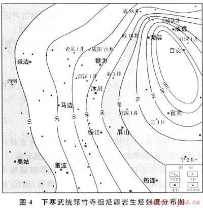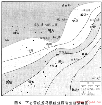 根據(jù)區(qū)內(nèi)烴源巖情況,選用殘余有機碳法計算烴源巖的生烴強度。區(qū)內(nèi)4套烴源巖的平均生烴強度計算結果分別為:下寒武統(tǒng)筇竹寺組為63×108m3/km2、下志留統(tǒng)龍馬溪組為44.5×108m3/km2、下二疊統(tǒng)為11.5×108m3/km2、下三疊統(tǒng)嘉陵江組為0.85×108m3/km2。各烴源層生烴強度的展布特征如下:下寒武統(tǒng)筇竹寺組烴源巖生烴強度高值區(qū)位于工區(qū)北東側的榮縣-威遠-自貢一帶,最大生烴強度為100×108m3/km2,平均生烴強度位于珙縣-屏山-犍為-樂山一帶(圖4);下志留統(tǒng)龍馬溪組烴源巖生烴強度高值區(qū)位于工區(qū)東南側的宜賓-筠連一帶,最大生烴強度為100×108m3/km2,平均生烴強度位于美姑-綏江-自貢一帶(圖5)。