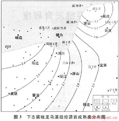 平面上,各層系烴源巖成熟度變化仍然較大:①下寒武統(tǒng)筇竹寺組烴源巖折算鏡質(zhì)體反射率最大,其烴源巖成熟度分布范圍為1.66%~4.31%,平均達2.5%,表明烴源巖已達過成熟階段,以產(chǎn)干氣為主。工區(qū)北側的犍為-樂山一帶烴源巖成熟度高,均已超過3.0%,西側的美姑-西河一帶烴源巖成熟度相對較低,約為2.1%,工區(qū)東南側的屏山-長寧-珙縣一帶烴源巖成熟度也相對較低,小于2.1%。②下志留統(tǒng)龍馬溪組烴源巖成熟度分布具有東側高西側低的特點,且烴源巖演化程度較高為2.4%~3.2%,平均達2.8%,烴源巖處于高成熟過成熟階段,以生氣為主。西側馬邊-陳子巖一帶烴源巖成熟度相對較低,約為2.4%(圖3)。③下二疊統(tǒng)烴源巖成熟度較高,為2.0%~2.7%,平均2.35%,烴源巖處于高成熟-過成熟階段,以生氣為主。在峨邊-樂山-威遠一帶烴源巖演化成度相對較低,為2.0%~2.1%;而工區(qū)南側和東南側的宜賓-屏山-雷波一帶烴源巖演化程度較高,為2.6%~2.7%。④下三疊統(tǒng)嘉陵江組烴源巖在各層系中成熟度最低,為1.0%~1.6%,平均為1.35%,烴源巖處于高成熟階段,以產(chǎn)濕氣為主,可產(chǎn)少量凝析油。
