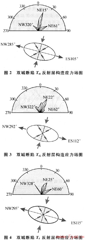 通過上述方法的研究分析后認(rèn)為:①雙城斷陷伸展時(shí)期原始邊界主斷層走向?yàn)镹NE15°~25°;②兩個(gè)共軛張扭斷層(走滑斷層)方向分別為NEE60°~62°和NW320°~328°;③雙城斷陷火石嶺組營城組火山巖段沉積時(shí)期構(gòu)造應(yīng)力場(chǎng)為主張應(yīng)力,方向?yàn)镹W(285°~295°)-SE(105°~115°),主壓應(yīng)力方向:NE(15°~25°)-SW(185°~205°)。