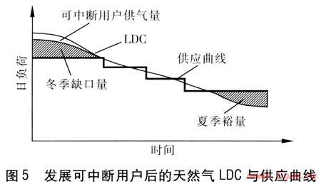 通過市場手段來減少城市天然氣冬季缺口量是燃氣企業(yè)的常用做法[3],即發(fā)展季節(jié)可中斷用戶。通過季節(jié)可中斷用戶用氣量的調(diào)節(jié),使冬季缺口量減少(即LDC的最高點降低,見圖5),減少了補充氣源在供氣高峰時的日供應(yīng)量,從而降低相應(yīng)的工程設(shè)施造價及其運行管理費用。