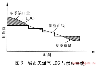根據(jù)城市天然氣的供氣特點,從圖3城市天然氣LDC與供應(yīng)曲線可以看出,冬季和夏季的峰谷差較大。據(jù)統(tǒng)計,北京市天然氣的冬夏季峰谷差達十幾倍,東北地區(qū)的冬夏季峰谷差在5倍以上,山東地區(qū)為2~5倍。由于燃氣企業(yè)與上游企業(yè)要簽訂照付不議合同,合同氣量應(yīng)盡可能地貼近市場需求曲線(LDC)的形狀,以縮短上游供應(yīng)的天然氣用不完的時間,減少照付不議的經(jīng)濟損失。由于供需不平衡,決定了在簽訂照付不議合同時,應(yīng)充分考慮年合同氣量、季節(jié)供應(yīng)系數(shù)、季節(jié)調(diào)峰設(shè)施規(guī)模、用氣市場規(guī)劃等因素,以期平衡協(xié)調(diào),用最小的設(shè)施投入及氣源采購成本取得適合的天然氣供應(yīng)量。下面利用LDC對上述幾個方面進行分析。
