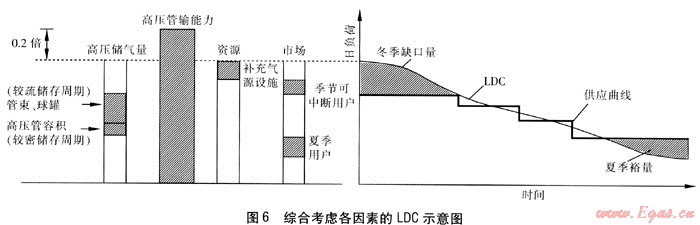 圖6的右邊反映出在照付不議供氣合同氣量與市場需求不一致的情況下,可能出現(xiàn)的冬季缺口量和夏季裕量,以及春秋季節(jié)某些天的供需不平衡,利用LDC有助于規(guī)劃各類氣源供應(yīng)以及市場發(fā)展策略。在圖6的左邊,有市場、資源、高壓管輸能力和高壓儲氣量4根柱狀圖。高壓儲氣量柱狀圖顯示:球罐和管束等對儲氣壓力有調(diào)節(jié)手段,能應(yīng)付變化幅度較大的調(diào)峰,對應(yīng)右邊LDC腰部的位置;高壓輸氣管道只有小時調(diào)峰能力而無季節(jié)調(diào)峰能力。高壓管輸能力柱狀圖比LDC最高點高出0.2倍,是提醒設(shè)計時應(yīng)考慮管輸能力比年最大用氣量目的用氣需求負荷高20%。資源柱狀圖表示解決冬季缺口量所需的工程手段,即補充氣源設(shè)施規(guī)劃。若冬季缺口量全部由工程手段解決將會使補充氣源設(shè)施龐大,造價高,且補充氣源全成本較高也會增加燃氣企業(yè)的運行費用。因此,應(yīng)從需求側(cè)(市場)做出規(guī)劃,即大力發(fā)展季節(jié)可中斷用戶,謹慎發(fā)展壁掛爐用