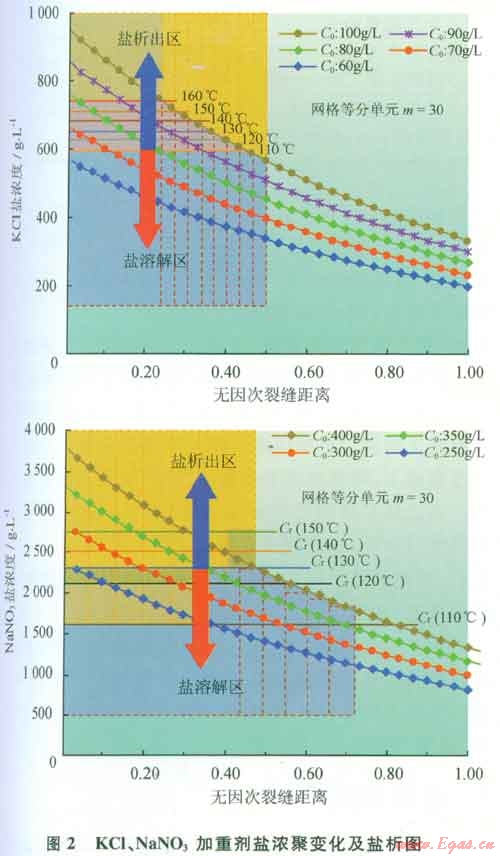 采用以上模擬原則,以KCl、NaN03加重液為例,分析加重液在高溫高壓氣藏增產(chǎn)過程中鹽析過程。圖2是KCl、NaN03模擬鹽濃聚變化和鹽析結(jié)果圖。從圖可看出,即使地面使用加重液鹽度遠低于該溶液的臨界飽和溶解度,但在高溫地層返排過程中加重液經(jīng)過逐漸濃聚后極易產(chǎn)生鹽析。如采用70g/L的KCl鹽水和250g/L的NaN03鹽水,20℃時其臨界飽和溶解度分別為254.8g/L和467g/L,但在高溫地層返排過程中經(jīng)過逐漸濃聚后,在距裂縫壁附近液體鹽度可高達620g/L和2000g/L以上,超過溫度110℃時兩者的臨界飽和鹽度(其臨界飽和鹽度分別為600g/L和1940g/L),部分鹽將從溶液中結(jié)晶析出,即產(chǎn)生鹽析現(xiàn)象。該濃度低于130℃時兩者的臨界飽和溶解度,因此當返排溫度為130℃時,溶液無鹽析現(xiàn)象屬于穩(wěn)定狀態(tài)。