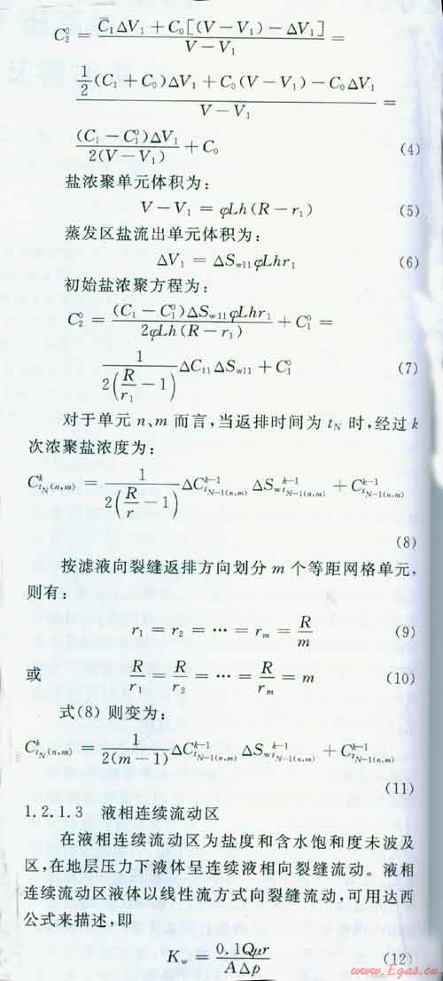 在返排初期,存在著濾液前緣初始蒸發(fā)區(qū)、過渡區(qū)和液相連續(xù)流動區(qū)。在濾液進入地層最前緣區(qū)主要存在氣一液混合相,即濾液與地層天然氣流體組成的水一烴多組分混合體系,其余濾失區(qū)充滿高鹽度的加重液濾液。受地層加溫作用,前緣區(qū)濾液溫度非常接近地層溫度,其溫度介于120~140℃。當開井返排時因壓力劇集下降,此時前緣區(qū)氣一液混合相將發(fā)生變化,部分濾液中液相蒸發(fā)成水蒸氣[2-3],并以氣一液體混合相向裂縫流動,使前緣區(qū)液相逐步減少,殘留液體的鹽度增加,并向相鄰單元擴散和傳輸[4-7],從而增加與此接觸過渡區(qū)液體的鹽度,其余區(qū)域濾液仍為連續(xù)液相向裂縫流動。