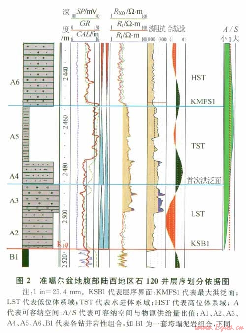 細(xì)的河道型沉積,緊鄰A3之上發(fā)育一套薄泥巖,在電阻率曲線上顯示一個(gè)明顯的低阻特征,指示首次大規(guī)模的湖進(jìn)面。水進(jìn)體系域以正常河流三角洲沉積(A4)體系為主,隨后發(fā)育了以粉砂巖為主的砂泥巖薄互層沉積(A5),顯示湖平面上升早中期的垂向加積為主的沉積特征,在A5之上發(fā)育薄的質(zhì)純高伽馬值泥巖,指示最大湖泛面位置KMFS1(也是一個(gè)下超面和視不整合面),上覆高含砂率的巖性組合(A6)指示高位體系域的進(jìn)積沉積體系[3]。