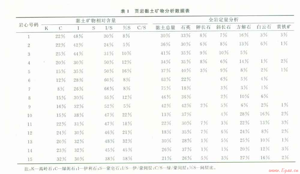 對(duì)所研究的頁(yè)巖氣藏的巖心進(jìn)行X射線衍射全巖分析和黏土礦物測(cè)定(表1),發(fā)現(xiàn)黏土礦物的總含量主要介于20%~70%,黏土礦物主要為綠泥石、伊利石、蒙皂石以及伊蒙混層,這些黏土礦物中伊利石和伊蒙混層的含量較高,伊利石相對(duì)含量主要介于20%~50%,伊蒙混層相對(duì)含量主要介于20%~70%.而蒙皂石和綠泥石的含量平均相對(duì)偏低。非黏土礦物主要為石英、鉀長(zhǎng)石、方解石、白云石、斜長(zhǎng)石、黃鐵礦等,其中石英的含量最高,相對(duì)平均含量在2()%~5()%,黃鐵礦和斜長(zhǎng)石的相對(duì)平均含量最低,介于l%~5%。石英含量越多說(shuō)明巖石的脆性越好,天然裂縫越容易發(fā)育,越有利于人工壓裂。