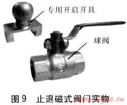 圖9所示的閥門(mén),針對(duì)市場(chǎng)普通的可控式燃?xì)忾y門(mén)在完全關(guān)閉狀態(tài)前球閥已經(jīng)密封但未完成進(jìn)入可控區(qū)域時(shí),用戶(hù)還可以逆時(shí)針開(kāi)啟球閥的缺陷而設(shè)計(jì)。該閥門(mén)是可實(shí)現(xiàn)提前角度可關(guān)不可開(kāi)功能的止退磁式產(chǎn)品。球閥開(kāi)啟狀態(tài)時(shí)手柄與管道軸線(xiàn)呈0°,球閥關(guān)閉狀態(tài)時(shí)手柄與管道軸線(xiàn)呈90°,手柄應(yīng)順時(shí)針關(guān)閉球閥,逆時(shí)針開(kāi)啟球閥,手柄在球閥已密封但未完全關(guān)閉狀態(tài)位置與關(guān)閉狀態(tài)手柄位置形成的角度即為提前角度。止退指關(guān)閉過(guò)程中只能夠順時(shí)針操作。閥門(mén)關(guān)閉狀態(tài)必須通過(guò)專(zhuān)用開(kāi)啟工具才能實(shí)現(xiàn)可自由開(kāi)啟。該結(jié)構(gòu)關(guān)鍵技術(shù)在于閥體凸頸沿徑向?qū)ΨQ(chēng)兩側(cè)面各外伸一個(gè)凸臺(tái),在兩凸臺(tái)分別開(kāi)設(shè)通孔,分別在通孔一端封閉且設(shè)有磁銷(xiāo)和彈簧;閥桿外側(cè)壁的相對(duì)兩側(cè)面上分別開(kāi)設(shè)兩個(gè)盲孔,盲孔設(shè)有限位槽以及提前角度止退結(jié)構(gòu)。當(dāng)閥從開(kāi)啟轉(zhuǎn)向關(guān)閉狀態(tài)過(guò)程中,閥體與閥桿配合進(jìn)入預(yù)設(shè)提前角度止退區(qū)域時(shí)(符合歐洲BS EN 331:1998《建筑物燃?xì)夤?yīng)設(shè)備用手動(dòng)球閥和密封底部錐體旋塞閥》規(guī)定的8°±1°夾角要求),閥體凸臺(tái)兩通孔內(nèi)設(shè)置的磁銷(xiāo)通過(guò)彈簧力進(jìn)入鎖定且止退狀態(tài)直至完全鎖定狀態(tài),實(shí)現(xiàn)提前角度止退可關(guān)不可開(kāi)的功能;當(dāng)閥從關(guān)閉到開(kāi)啟狀態(tài),需要通過(guò)專(zhuān)用開(kāi)啟工具內(nèi)的強(qiáng)磁與閥內(nèi)的磁銷(xiāo)通過(guò)磁場(chǎng)“同性相斥,異性相吸”的原理方可開(kāi)啟閥門(mén)。產(chǎn)品出廠時(shí)一般設(shè)置為開(kāi)啟狀態(tài)。